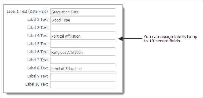 Field labels have a 30-character limit. The first secure field accepts a date only, but any label can be assigned to the field. For example, Graduation Date. If a field is left blank, it does not appear on the Secure Information tab in Member Details.