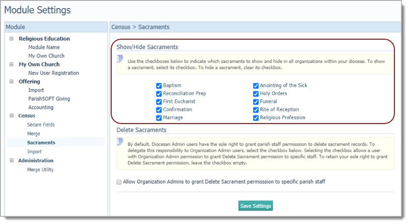 To assist with the task of managing sacrament data, the Sacraments page provides options that enable diocesan administrators to globally configure options that determine which sacrament data organizations can see and modify as well as delete.