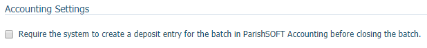By default the checkbox is not selected. Select the checkbox to force the system to create a deposit entry for a batch in ParishSOFT Accounting before it closes a batch. If the system detects that no deposit entry exists for a batch, the system will not close the batch.