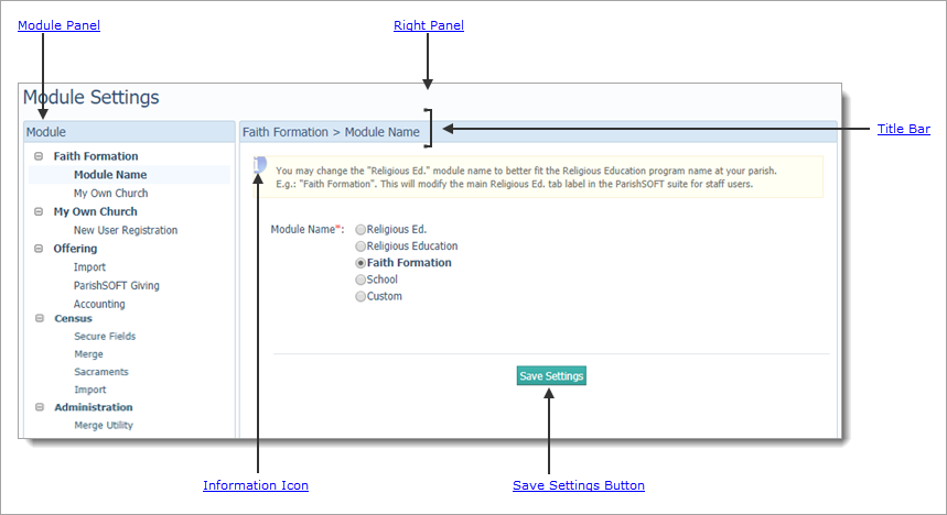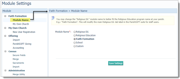 The Module Settings page provides a central location for you to configure settings associated with modules in the ParishSOFT Family Suite.