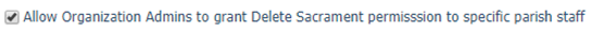 By default, the option is disabled, so only diocesan administrators can delete sacrament records. If you want to allow parish administrators to grant delete permission to specific staff within their organizations, select this checkbox: