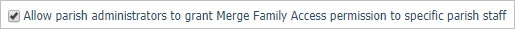 By default, only users with Diocesan Admin permissions can merge family records and grant Merge Family Access permission to staff. This section provides a checkbox control that enables users with Diocesan Admin permissions to globally grant family merge permission to parish administrators. In turn, parish administrators in their respective organizations can give themselves as well as selected staff permission to merge family records.