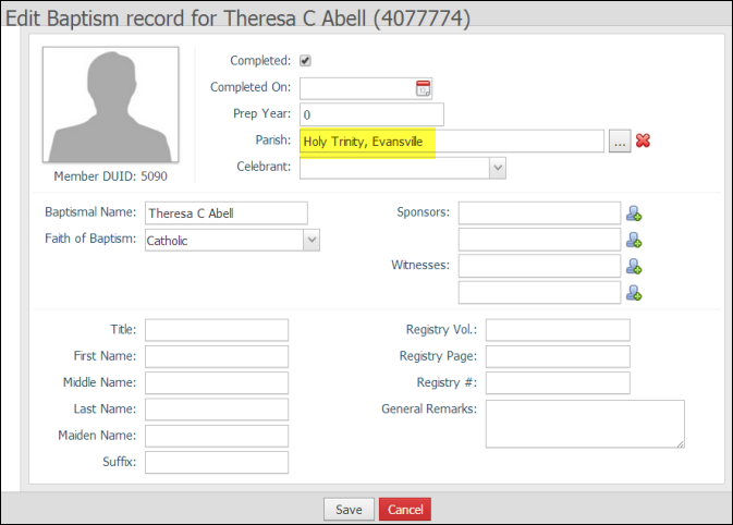 If an individual's sacrament record shows the name of the parish only, you can use the instructions in this topic to update the record to include the name of the city where the parish is located. This feature is particularly useful if you have parishes in your organization that have the same name. Updating the record with the city name enables you to differentiate them. Adding the city name to the record also enables you to create a sacrament certificate that shows the parish location.